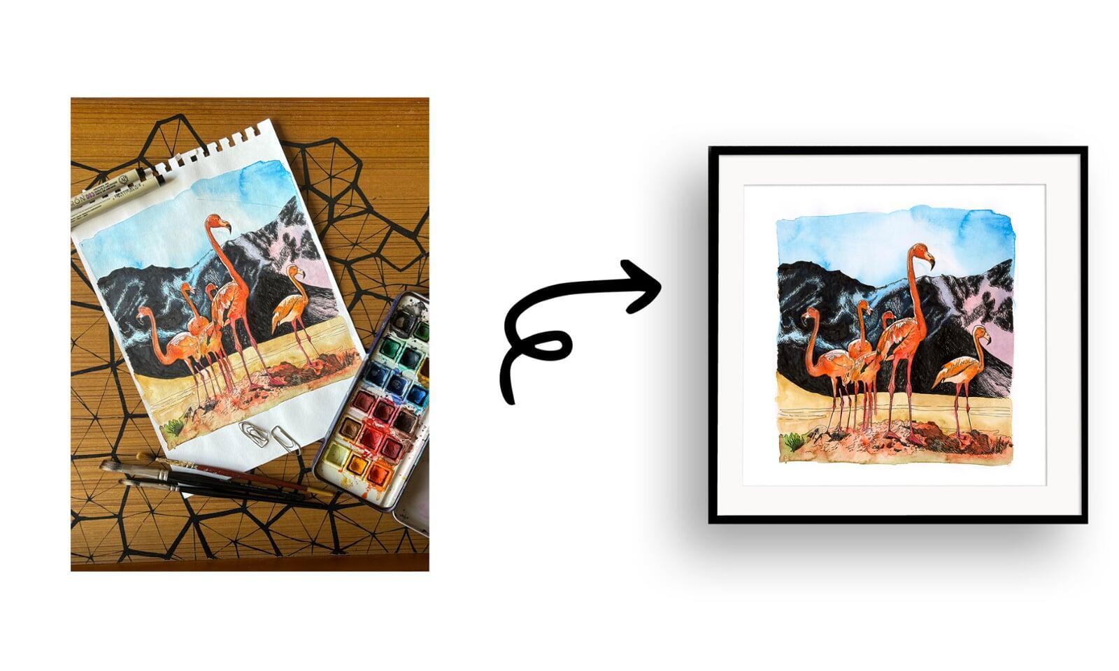 Framing Tip: A clean, white or light wood frame with a floating mount enhances the flamingos’ brightness while letting the textured mountain inkwork shine.