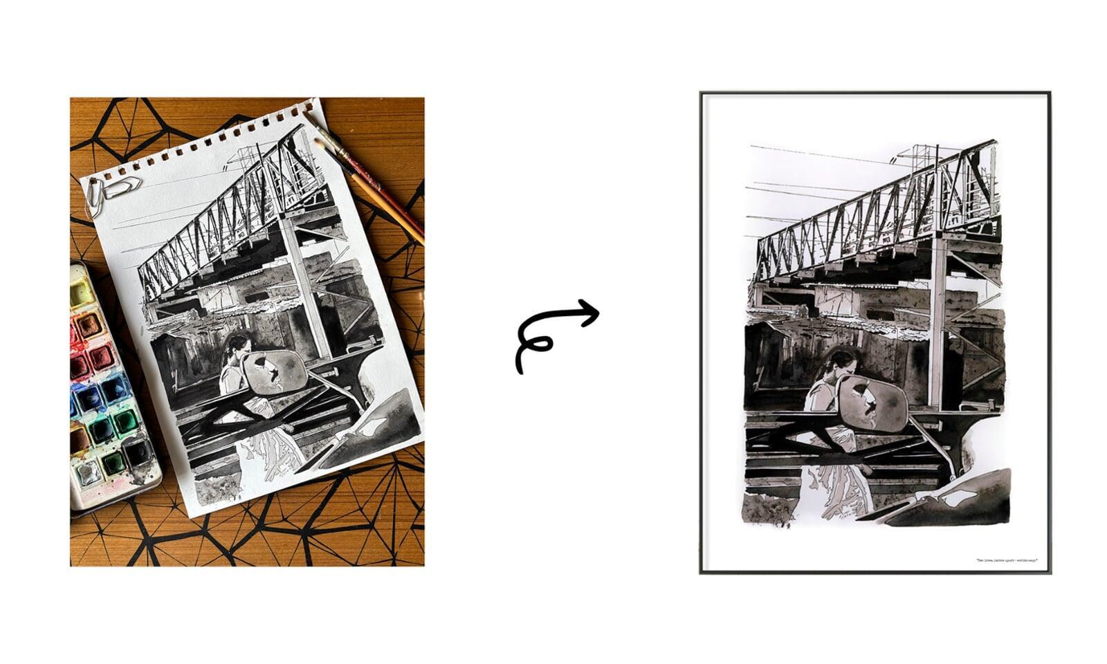 This evocative artwork, rendered in pen and watercolour, captures a moment heavy with social contrast and quiet introspection. The composition centers on a woman in a traditional sari, walking past a side mirror of a car, which reflects the face of a man—likely seated inside the vehicle. Above them looms a stark railway bridge, a symbol of movement and transition, cutting across the space with cold geometry. The background appears as a dense urban environment, possibly an informal settlement, with overlapping textures and shades of grey-brown ink.